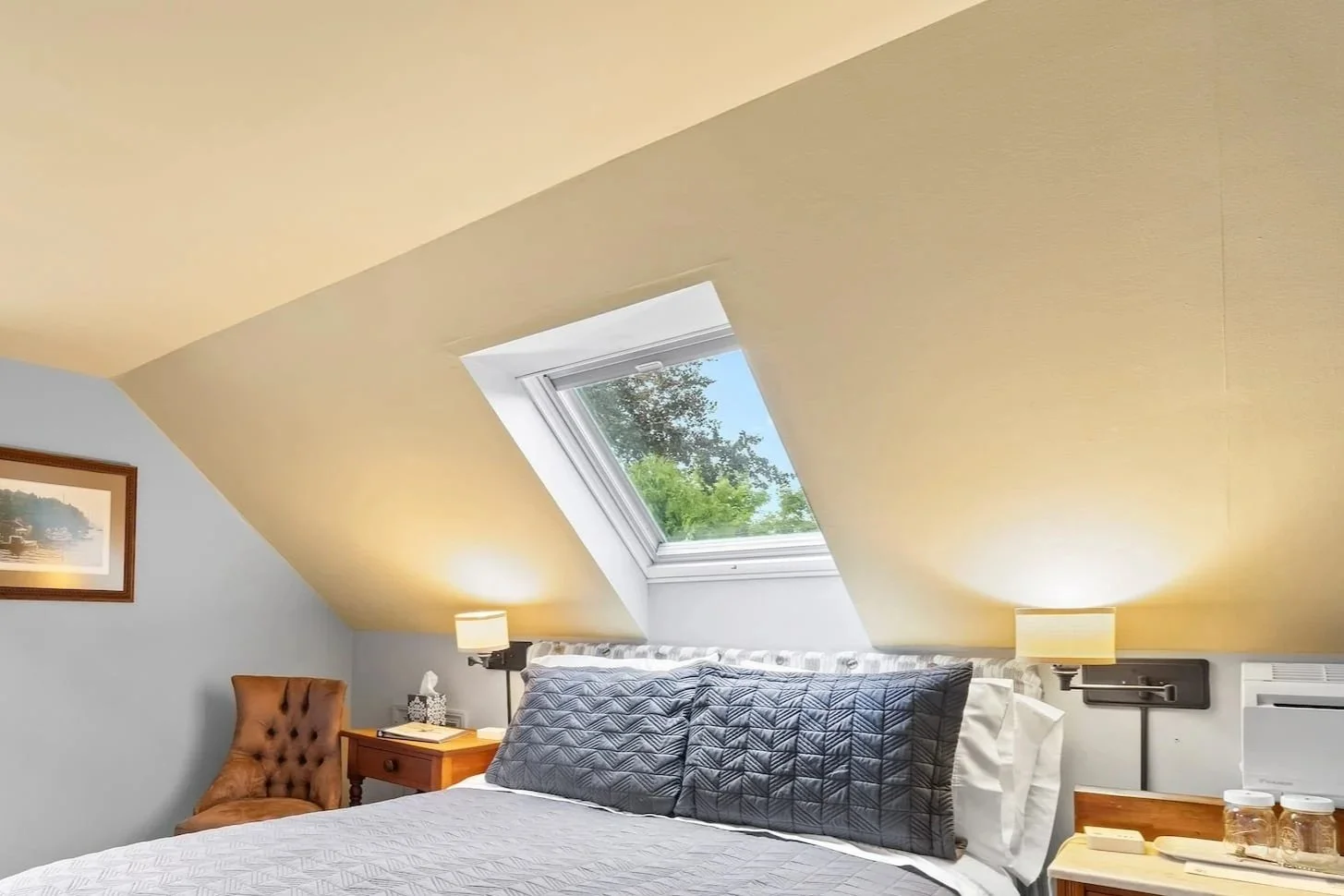A welcoming skylight and classic sloped ceilings create the feeling of a cozy perch above the property. Natural light fills the room by day, while the elevated third-floor setting adds a quiet, tucked-away sense of retreat.